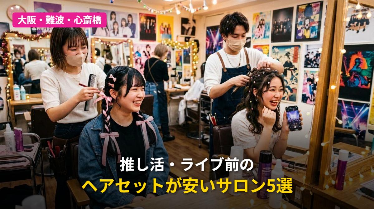 難波・心斎橋エリアには、980円~で利用できるヘアセットサロンが充実しています。推し活・ライブ前のヘアセットで大切なのは、「アクセスの良さ」「価格の安さ」「推し活に理解のあるスタイリスト」の3つ。