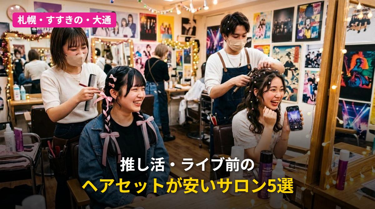 今回は札幌・すすきの・大通エリアにあるヘアセットが安いサロンを5店舗厳選してご紹介します。量産型ヘアメや編みおろし、ツインテール、リボンアレンジなど、ライブ映えするスタイルが得意なサロンを集めました。