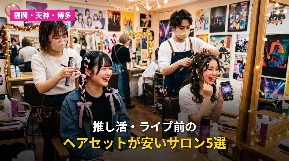 福岡・天神・博多エリアには、ヘアセット¥1,200~という格安サロンから、推し活・ライブ専門のスタイルが豊富なサロンまで、幅広い選択肢があります。